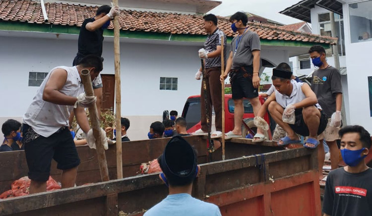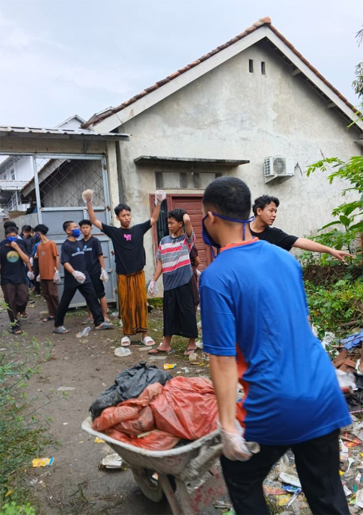 Para santri Pondok Pesantren Api Al-Ghozali bergotong royong membersihkan sampah di TPS di seputar area pondok pesantren pada Senin, 16 Februari 2026 – (Sumber: Rizki Ramadani)
