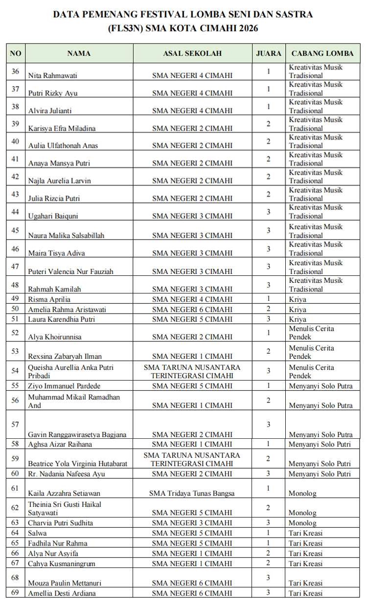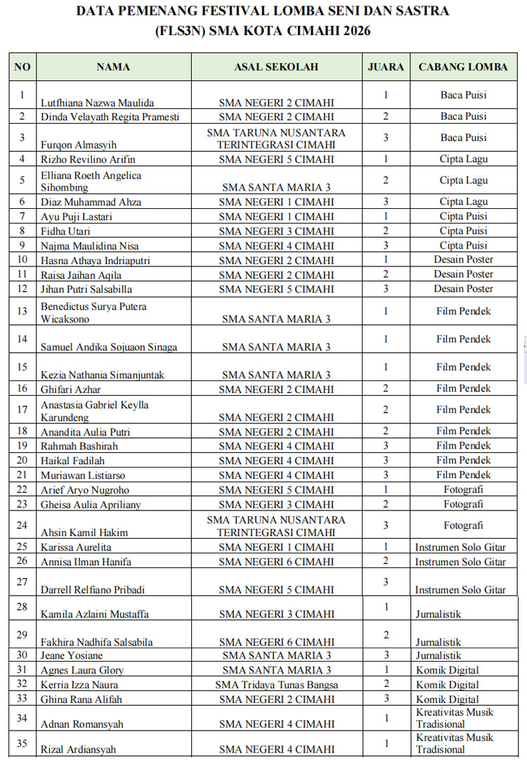 Terkait dengan kegiatan FLS3N 2026 Tingkat Kota Cimahi untuk SMA/MA/SMK/MAK/Sederajat, para juaranya akan ditampilkan pada acara Pameran Pendidikan di Kota Cimahi.