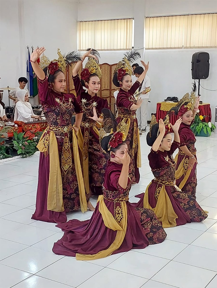 Para penari dengan gemulai dan lincah bergerak secara harmoni membentuk konfigurasi yang indah. Kostum penari berwarna merah dengan balutan selendang kuning membuat mata penonton tak berkedip menyaksikan penampilan para siswa SMA yang penuh talenta ini. Terkadang terdengar riuh rendah suara penonton yang merasa kagum atas penampilan mereka.