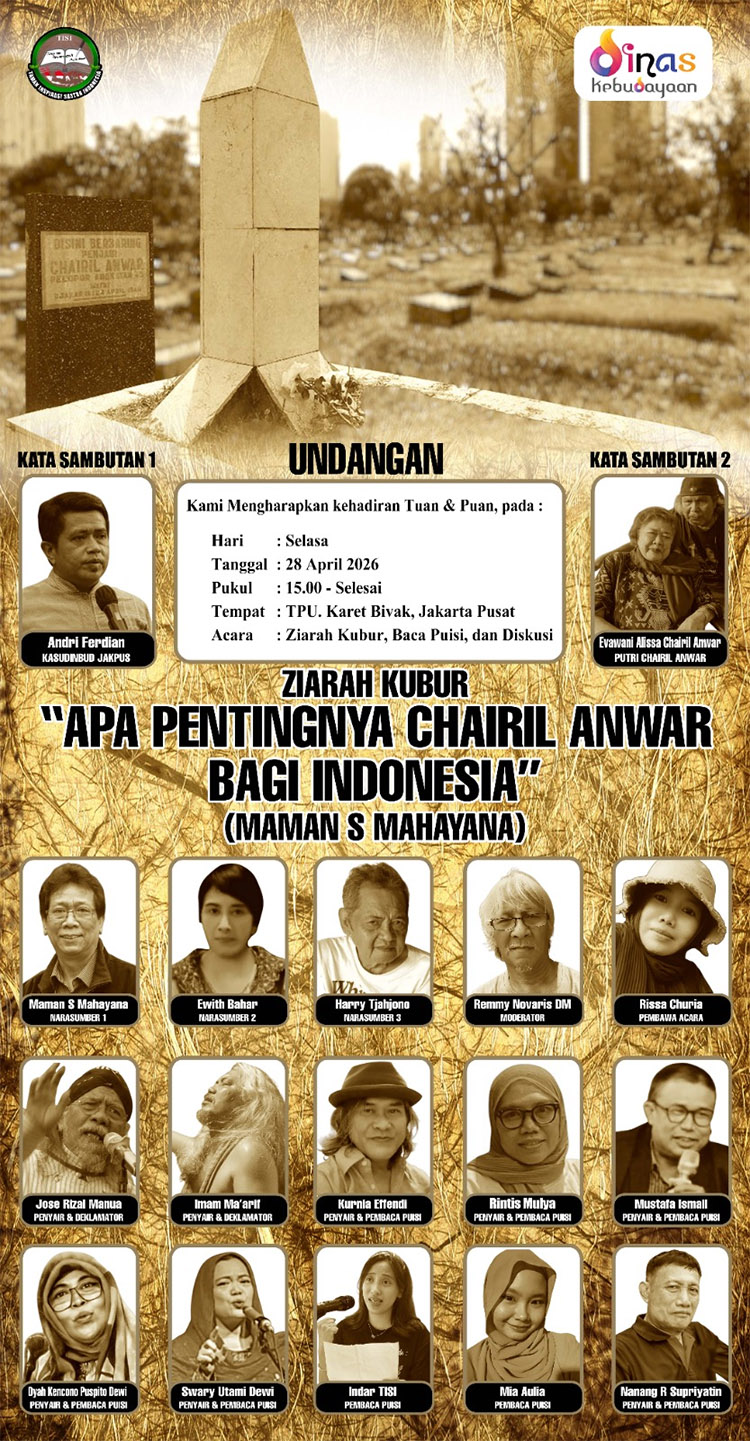 BERITA JABAR NEWS (BJN), Jakarta, Jumat (24/04/2026) – Untuk memperingati wafatnya Penyair dan Pujangga Besar, Chairil Anwar ─ sebagai pelopor sastra Angkatan’45, Komunitas Sastra TISI (Taman Inspirasi Sastra Indonesia) kembali akan mengadakan ziarah kubur, diskusi, dan baca puisi ke Makam Chairil Anwar. Kegiatan ini rencananya akan dilaksanakan di TPU Karet Bivak, Jakarta Pusat pada Selasa, 28 April 2026 yang akan datang, yaitu dimulai pukul 15.00 WIB s.d. selesai.